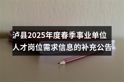 为做好泸县2025年度春季事业单位人才引进工作,按照2025年4月2日中共泸州市委组织部、泸州市人力资源和社会保障局通过泸州人事考试网发布的《泸州市2025年度企事业单位人才岗位需求信息》公告(以下简称《需求信息》)要求,结合工作实际,就有关事项作补充公告如下: